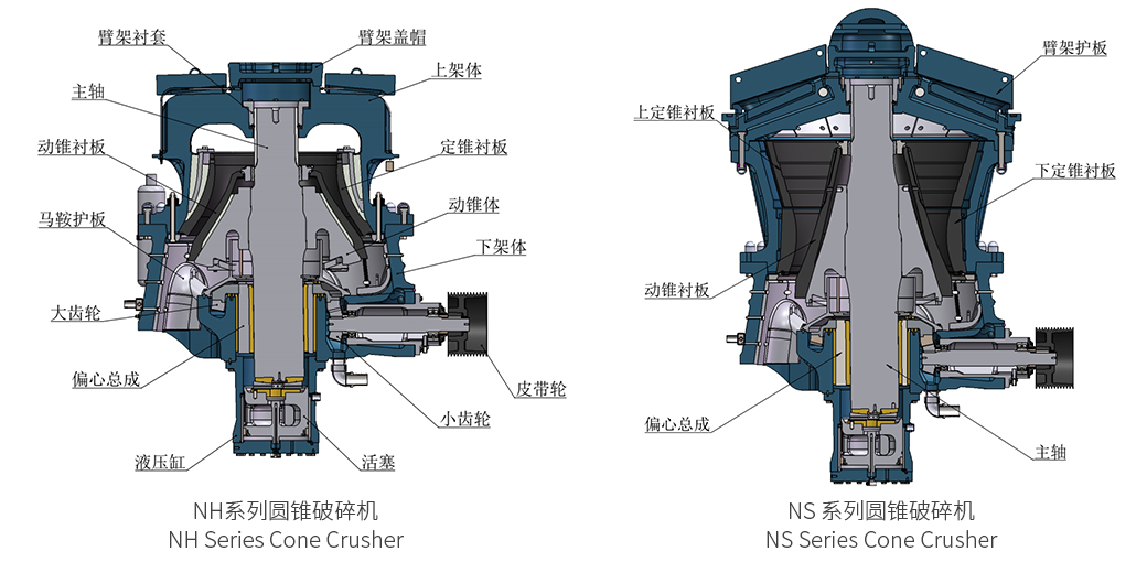 電機經由大小齒輪帶動偏心套組件旋轉,由偏心套組件迫使主軸以懸掛點為中心,繞機器中心線旋擺運動。動錐的運行軌跡看起來是在破碎腔內來回擺動,同時緩慢的旋轉。物料被擺動的動錐擠壓破碎;